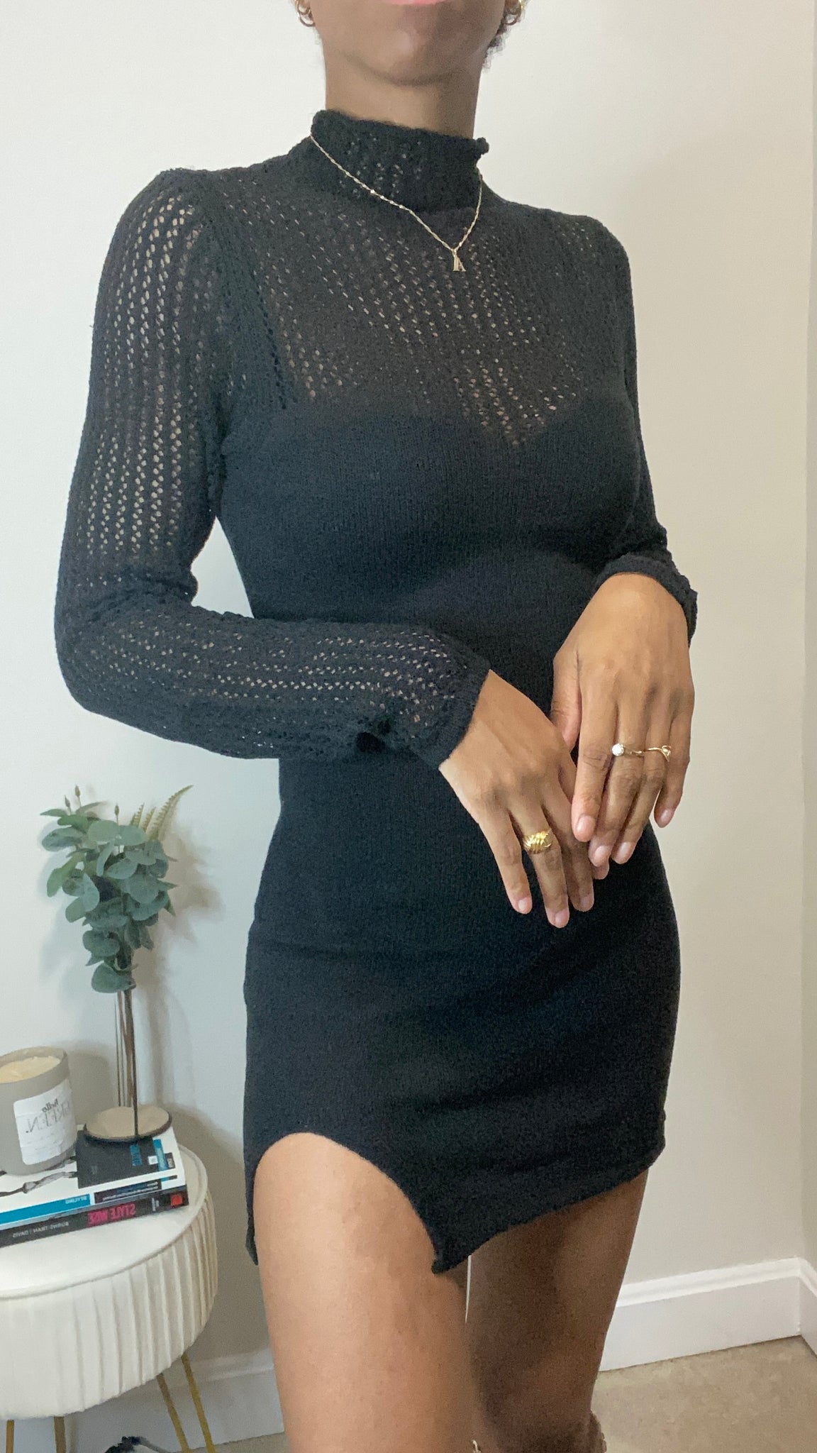 Long sleeve knit mini dress with mock neck, mesh top and sleeves, sweetheart neckline and thigh slit.
