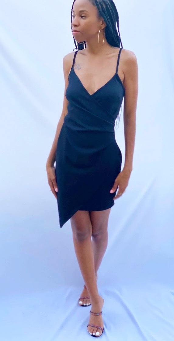 Surplice mini dress with front wrap detail, asymmetrical hem and ruching.