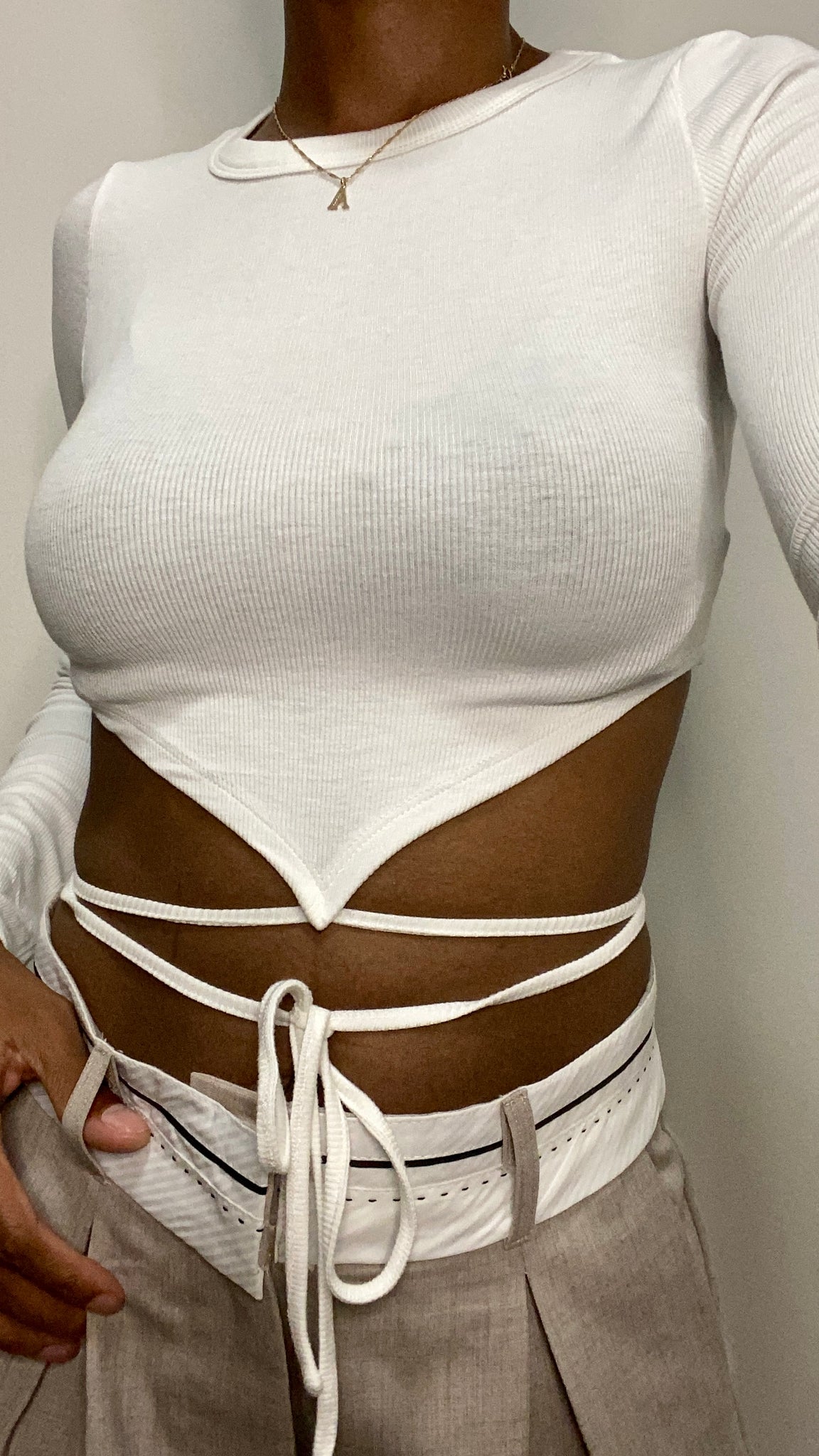 Tie back, round neckline, v-shape waistline. Stretch ribbed fabric