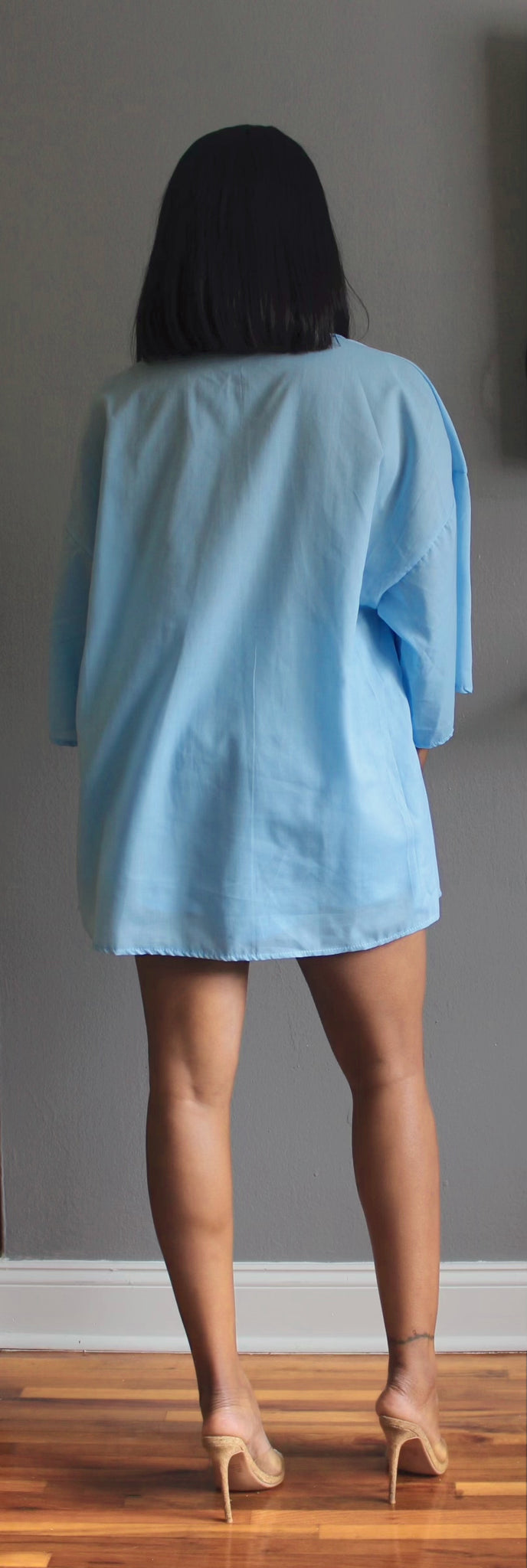 This solid blue lightweight short set comes with a 3/4 short sleeve button down top. This cute and comfortable short set features an elasticized waist with matching drawstring and two front pockets with a relaxed and comfortable fit. The versatility of this set allows you to dress it up for many occasions. Curved hem at side seems