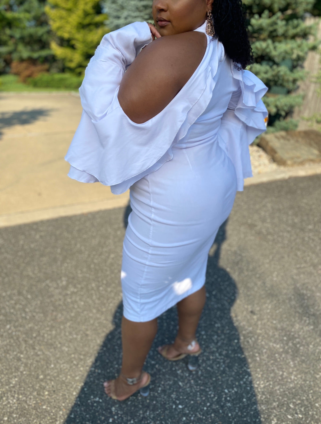 This dress brings all the drama. It is a solid midi in a bodycon fit, with long bell sleeves, a mock neck, cold shoulders, racerback, and ruffle trim.