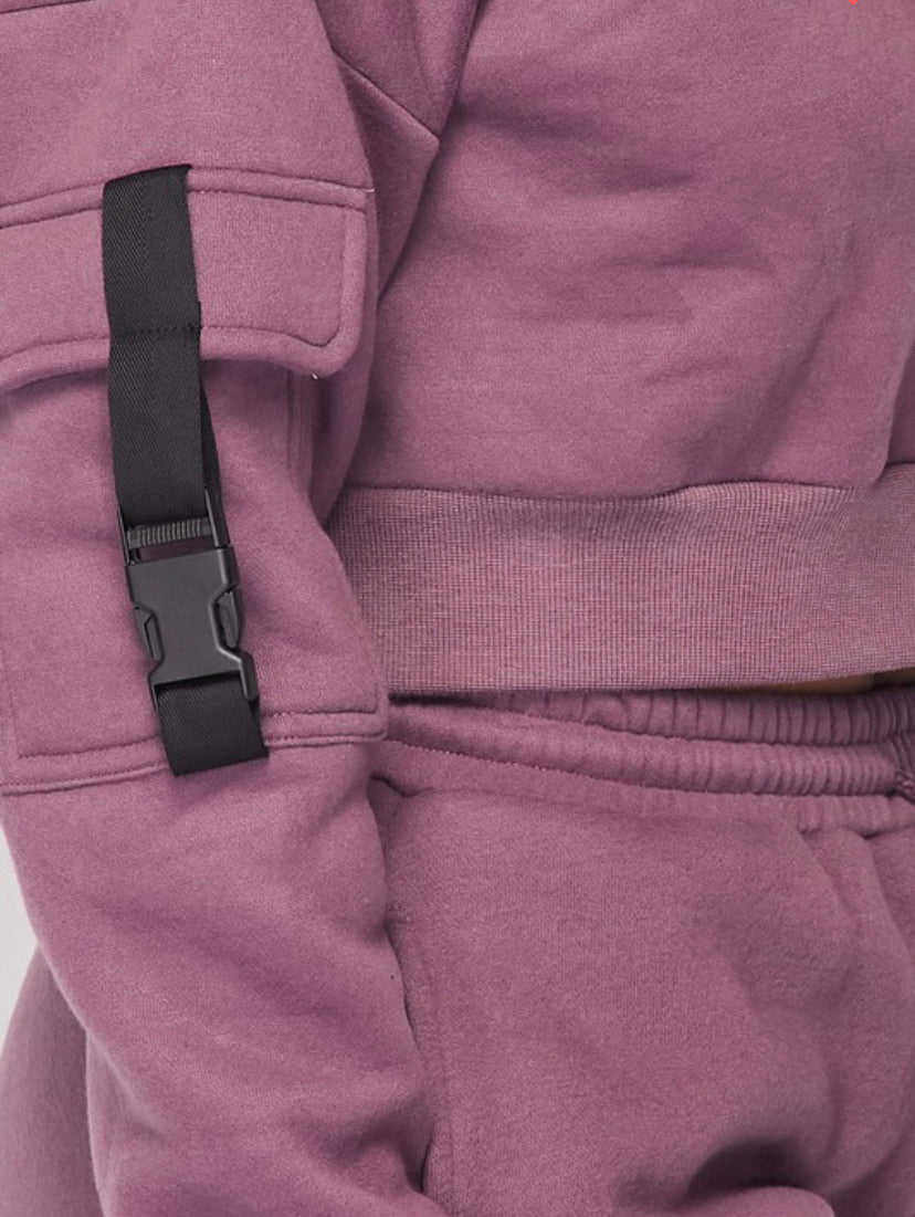 The hoodie has two cargo pockets on the sleeves with buckle closure. The joggers feature an elastic waistband, drawstring, and side pockets. They also can be worn high-waist if you prefer not to show your stomach.