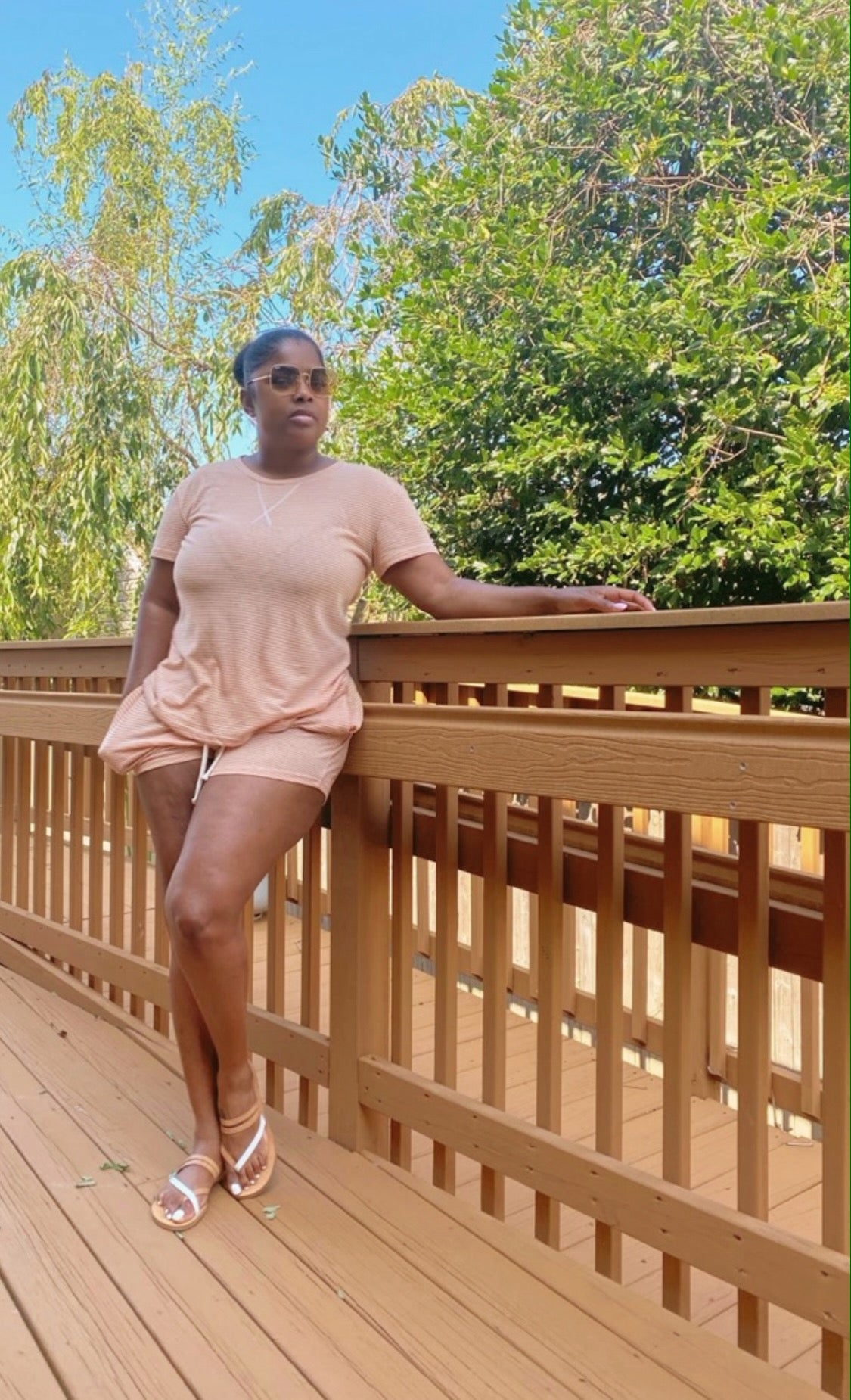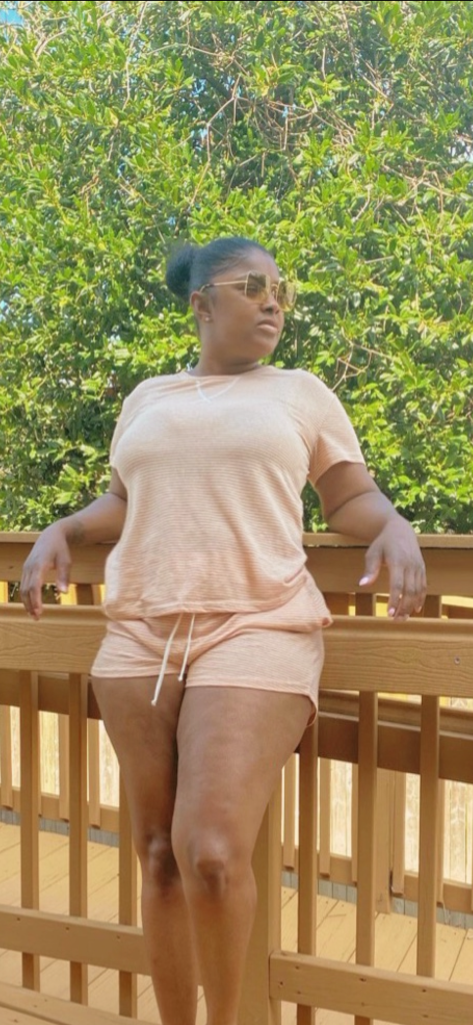 This comfortable set is great for lounging. This set has a horizontal stripe pattern to give it a unique look. The shorts to this set has strings for adjustable purpose & the top has a crew neck. This set is made to be loose fitted for comfort.
