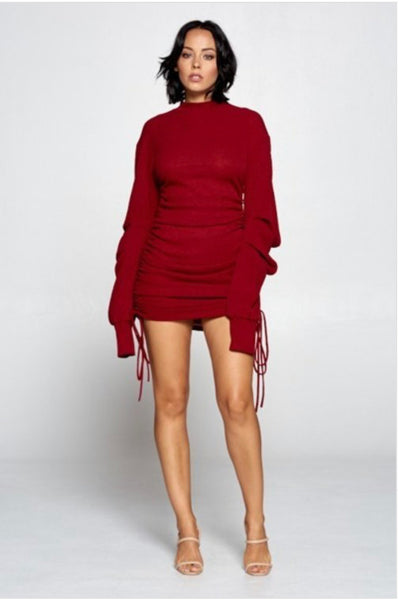 Sweater dress with mock neck, gathered sleeves, adjustable drawstring and side ruching.