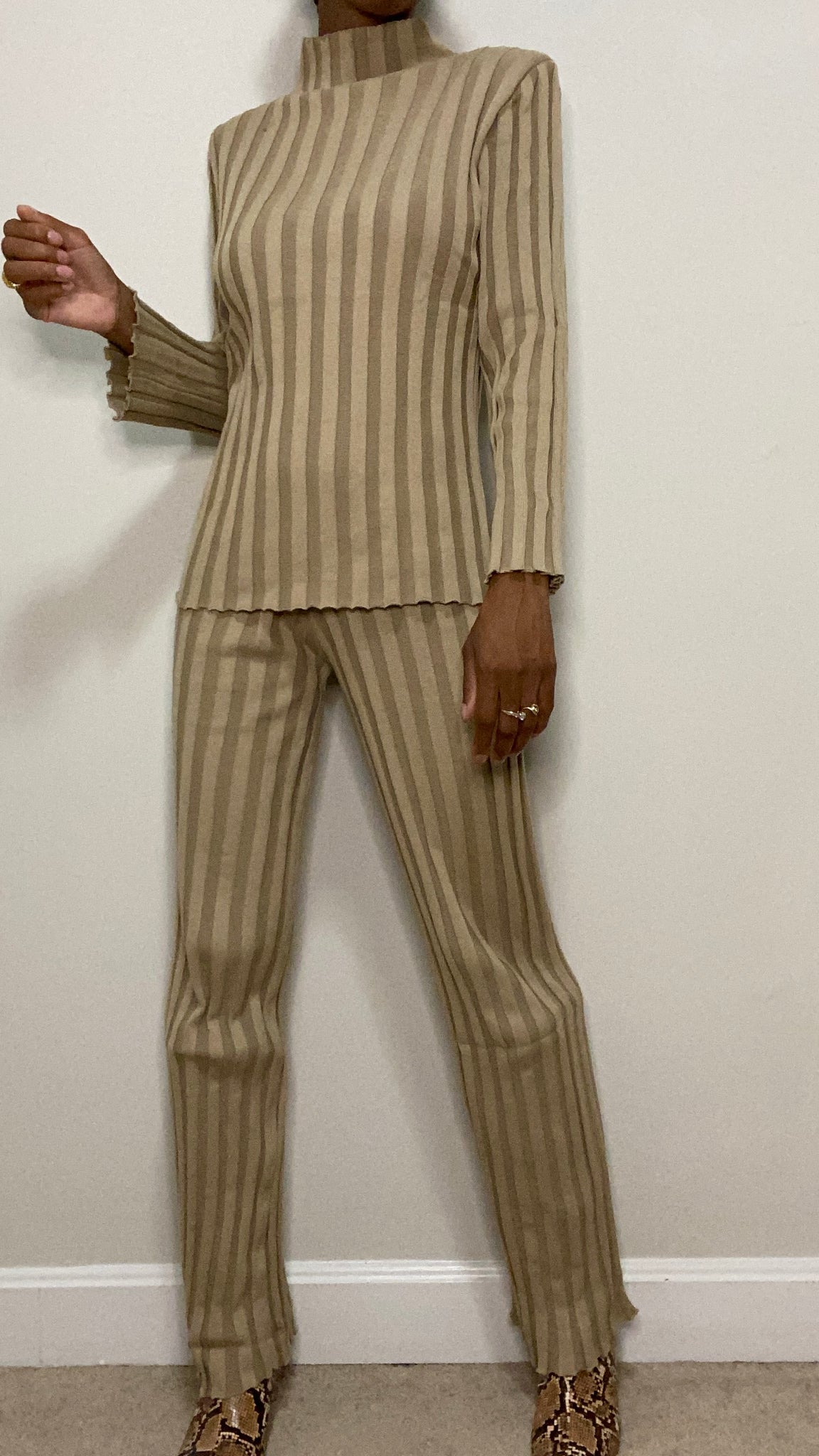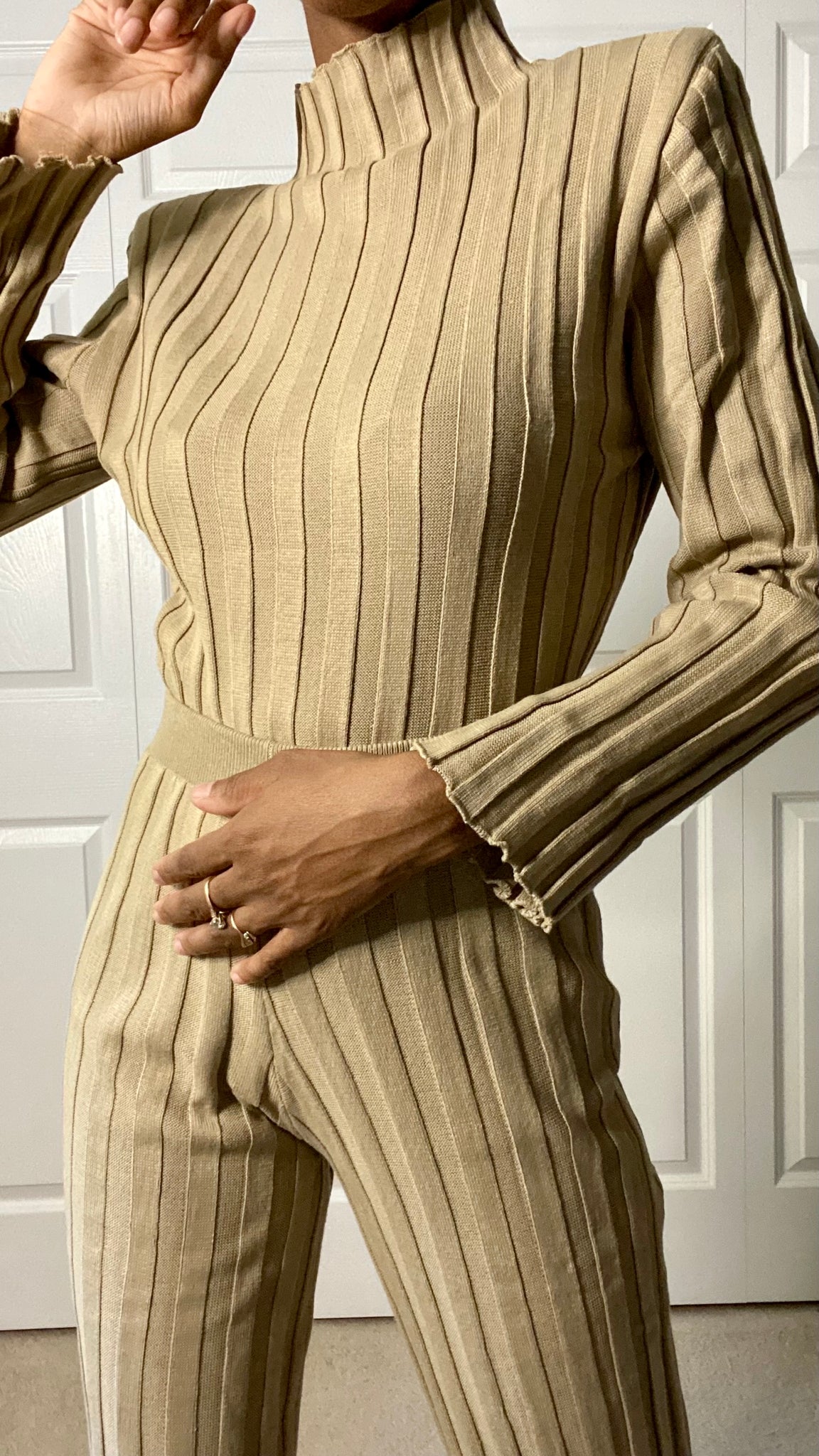 Effortless comfort meets quiet luxury. This soft ribbed knit set features a sleek mock neck top and subtly flared pants that move with you — from cozy mornings to chic nights out. The neutral tone and vertical texture create that “put-together without trying” vibe. Style it with sneakers for errands or gold hoops and heels for dinner — either way, you’re serving relaxed sophistication.