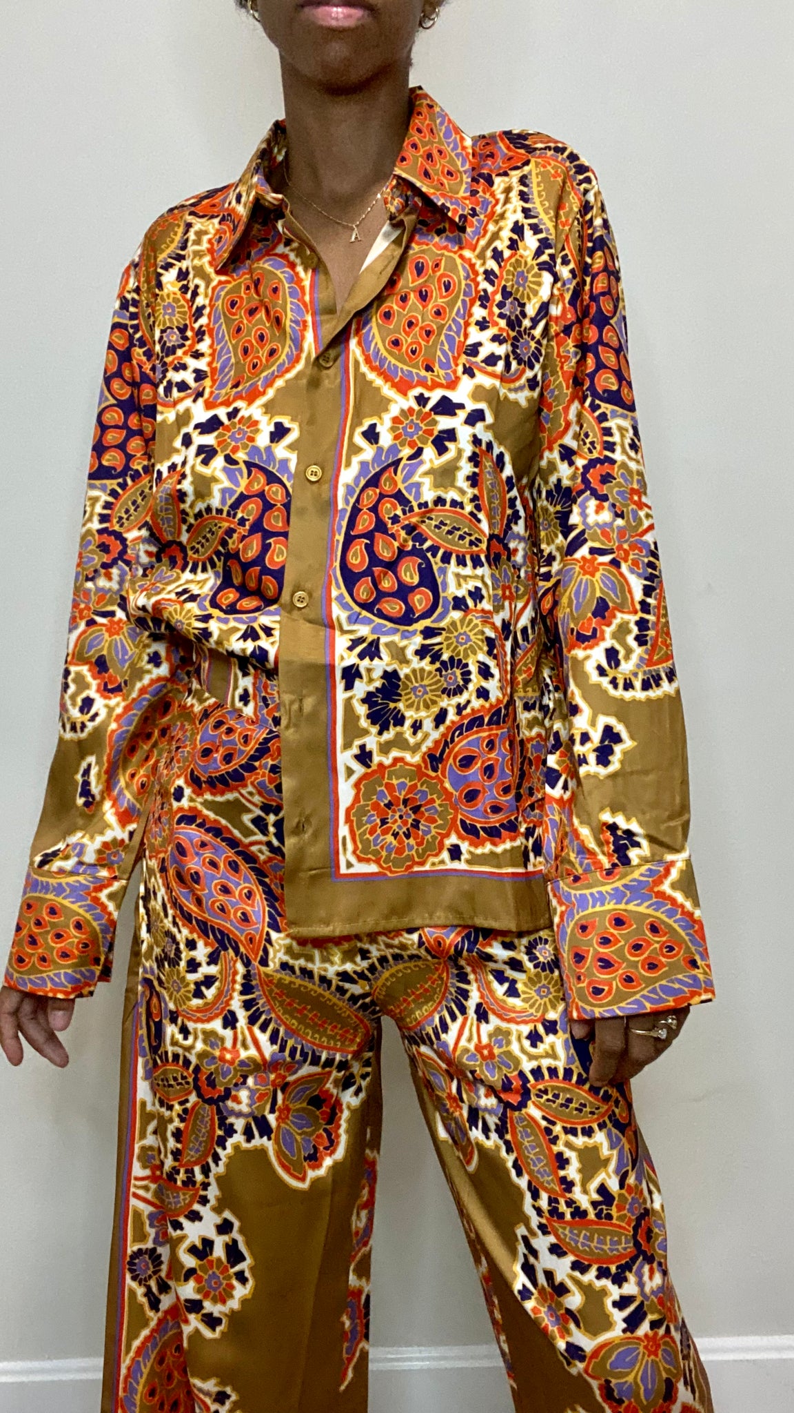 Spice up your look with the Everything's Golden Satin top. It features an all over beautiful paisley print in such gorgeous rich shades of brown, red, blue and white. It's lightweight woven satin fabric, long sleeves with button cuffs, collar and side slits. Dress it up casually with jeans or pair it with the matching pants for a complete look.