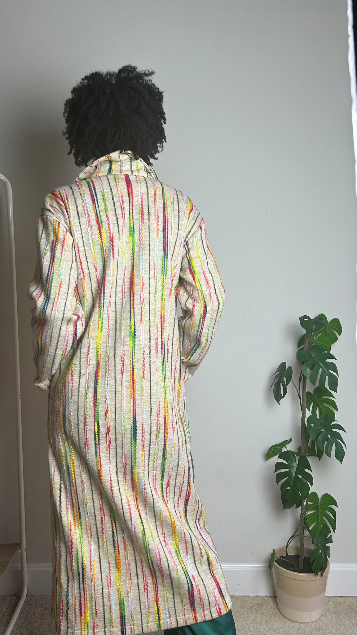 There's no denying that sometimes the coat IS the outfit and that's definitely true in this case. This statement coat is sure to steal the show with its all over multicolor stitching.