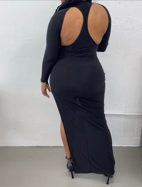 Long sleeve turtleneck dress with front and back cutout detail and thigh high slit