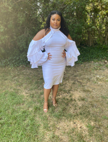 This dress brings all the drama. It is a solid midi in a bodycon fit, with long bell sleeves, a mock neck, cold shoulders, racerback, and ruffle trim.