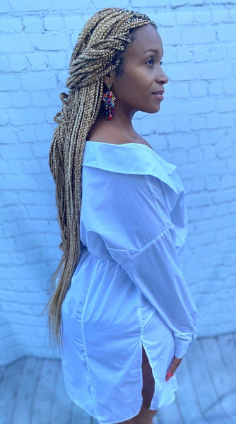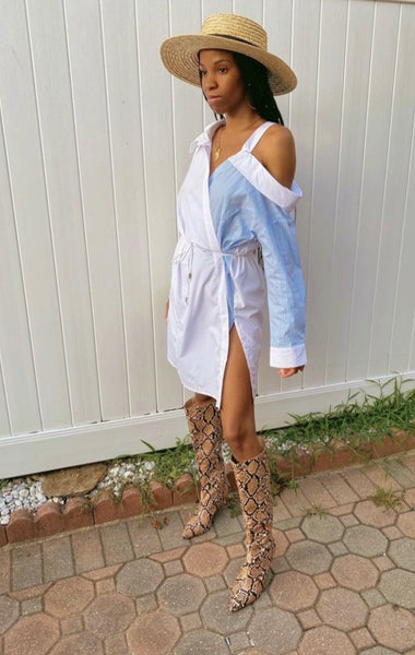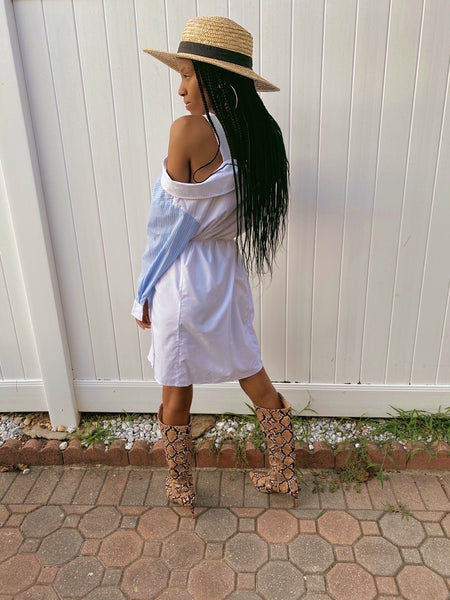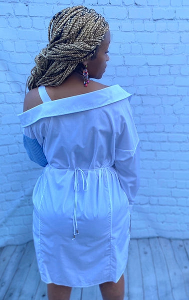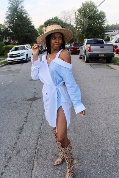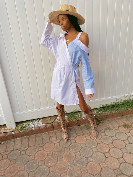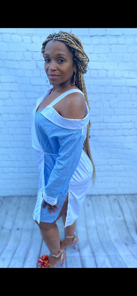 Self tie cold shoulder, wrap around midi dress. Solid on one side and striped print on the other. Sleeves are cuffed with button closure. Dress has slits on both sides.