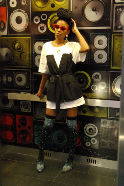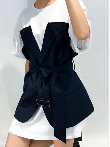 This fashionable take on a t-shirt dress allows you to be casual and chic. It features an attached tuxedo style belted v-neck bodice with front button closure, faux pockets, and back slit. The belt cinches the waist and gives the appearance of a 'fit and flare' style. Can be worn as a dress or as a top.