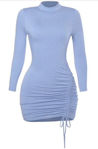 Long sleeve mini dress with mock neck, side ruching & self tie .