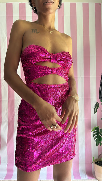 Gleaming in a magnificent hue of pink, this strapless mini dress boasts a spectacular sequin fabric and alluring cutouts, making this piece a must-have for a gorgeous night out.