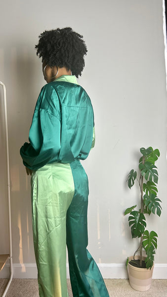 Look effortlessly chic in this gorgeous emerald green two-tone satin pant set! The luxurious fabric is sure to turn heads, while the color block effect will have you feeling like a million bucks. Show up in style and leave 'em green with envy - it's time to shine