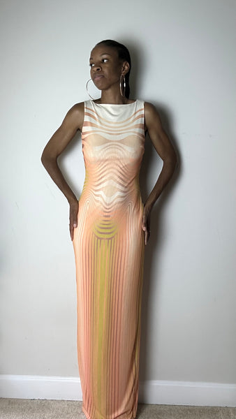Indulge in the warm hues of the sun with our Here Comes The Sun Orange Bodycon Maxi. This sleeveless printed dress hugs your curves, creating a flattering silhouette. The vibrant orange color adds a touch of energy and fun to your look. Perfect for any occasion, this dress will make you feel confident and stylish.