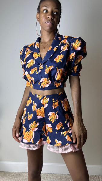 Revamp your summer wardrobe with our Navy Floral Print Short Set! The vibrant navy and orange floral print will make you stand out in any crowd. The matching crop top adds a trendy touch, while the puff sleeves and ruffled shorts provide a charming and feminine look. Perfect for any summer occasion, this set is a must-have for any fashion-forward individual!