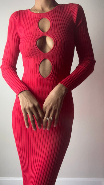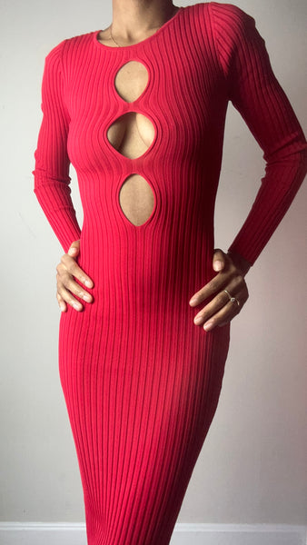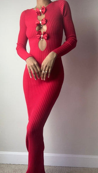 Slip into this Lady in Red Knit Cutout Maxi Dress for a chic and flirty look. The rib knit fabric hugs your curves while the front cutouts and playful bows add a touch of fun. Perfect for a night out or a special occasion, this maxi dress will keep you looking and feeling confident.