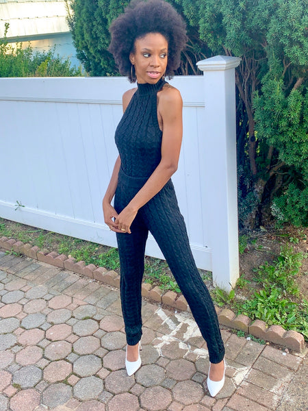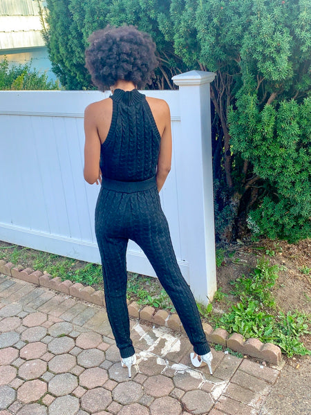 Set includes a cable knit cropped top featuring a halter mock neckline and ribbed trim & a pair of cable knit pants with an elasticized waist, full length and a ribbed trim.