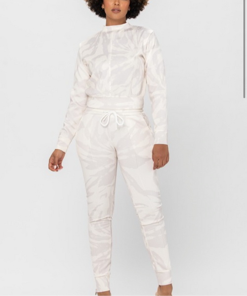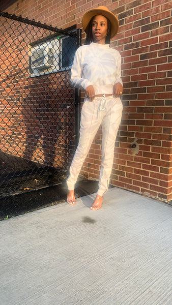 The Mone’t set features an all over vortex print. Unlike many of our other jogger sets this set is giving sporty chic. It features a mock neck crop top and matching jogger pants. The pants have an elastic waistband and self tie drawstring for adjustments. Seams run down the front and back of the legs and there are zippers along the ankles to allow for a skinny fit it split hem if worn unzipped.