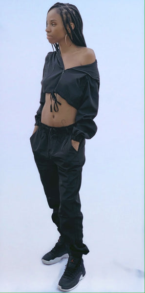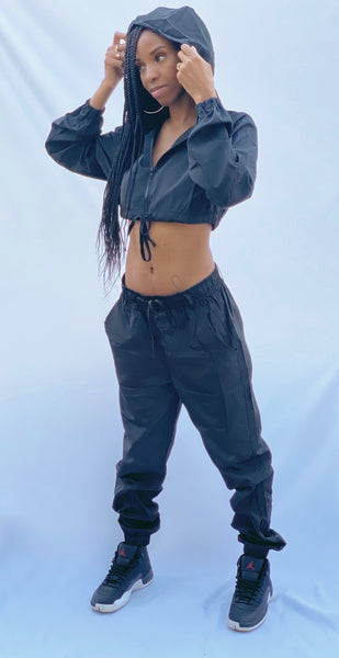 This jogger set is way too cute to actually jog in. It features a cropped hooded jacket with adjustable drawstring, front zipper closure and side pockets. The pants are full length and tapered at the ankles. It has an elastic waistband, drawstring, deep pockets and belt loops.