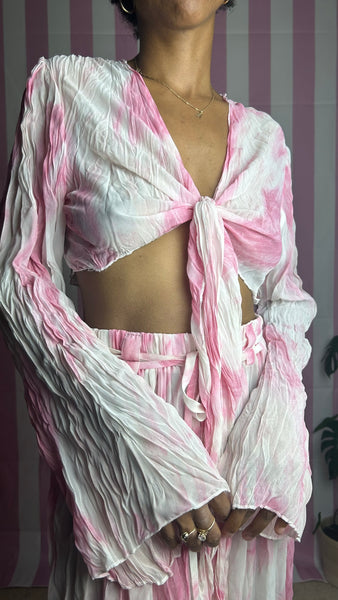Look like a total dream come true in this ultra-trendy pink crinkled tie dye pant set! Rock the ultimate flares with a long sleeve crop top for the perfect balance of cool and cozy. All the looks, zero effort necessary! 🤩