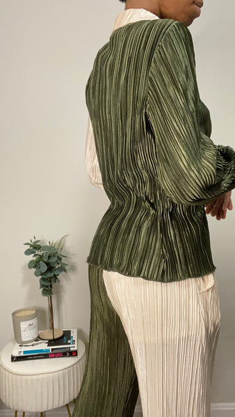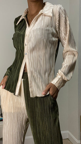 Color block plisse pant set with long sleeve button up top and matching pants.