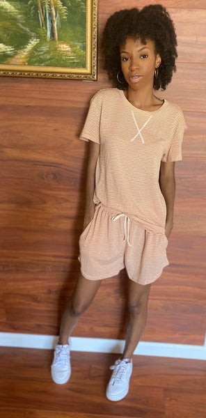 This comfortable set is great for lounging. This set has a horizontal stripe pattern to give it a unique look. The shorts to this set has strings for adjustable purpose & the top has a crew neck. This set is made to be loose fitted for comfort.