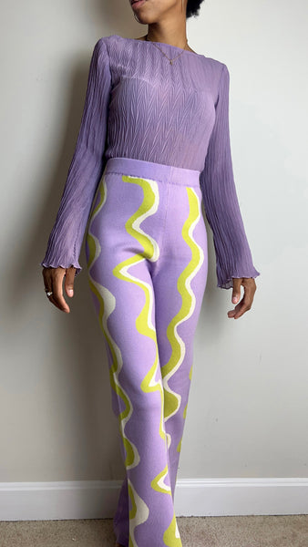 Take your look to the next level with these Lavender swirl knit sweater pants! Their striking lime green and lavender design will turn heads and make you stand out in the crowd. With their high waist and comfortable fit, you'll be ready to take a risk and make a bold statement!