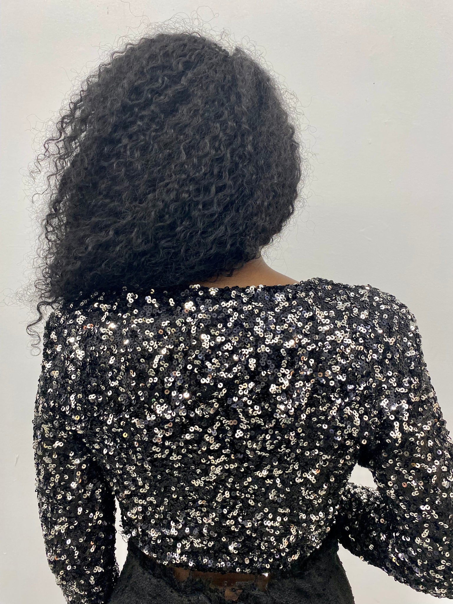 Nothing screams New Years Eve like sequin. Get into the holiday party mood in this sexy cropped sequin top. It’s long sleeve with a deep plunging v-neckline. Looks great paired with our “More Than Jewels” high waisted skirt.