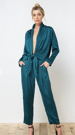 Satin jumpsuit featuring plunging self tie neckline , long sleeves, pleated high waist, front tie closure, elastic waistband and side pockets