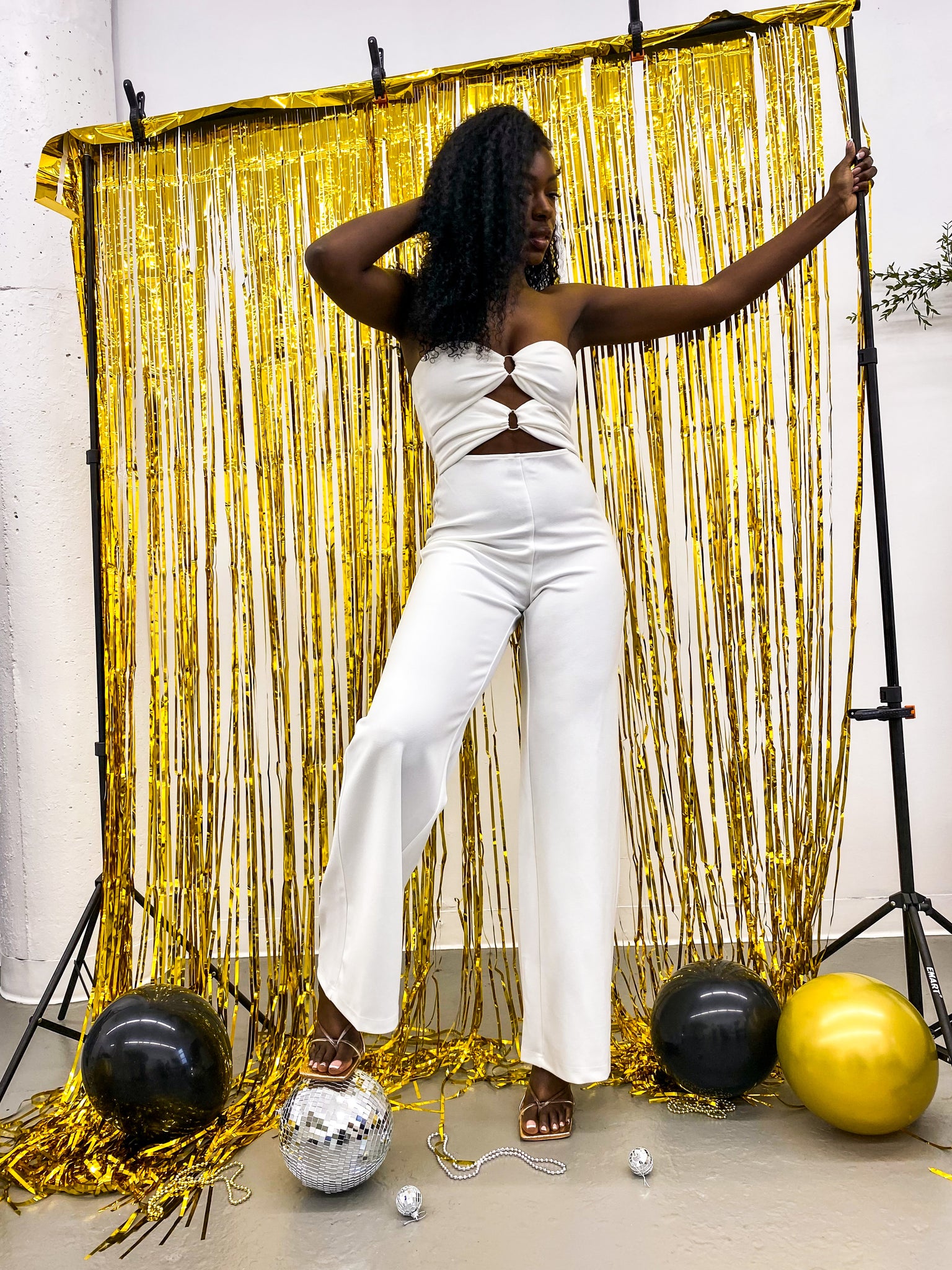 Strapless jumpsuit with tube top, o ring cutout detail and wide leg pants