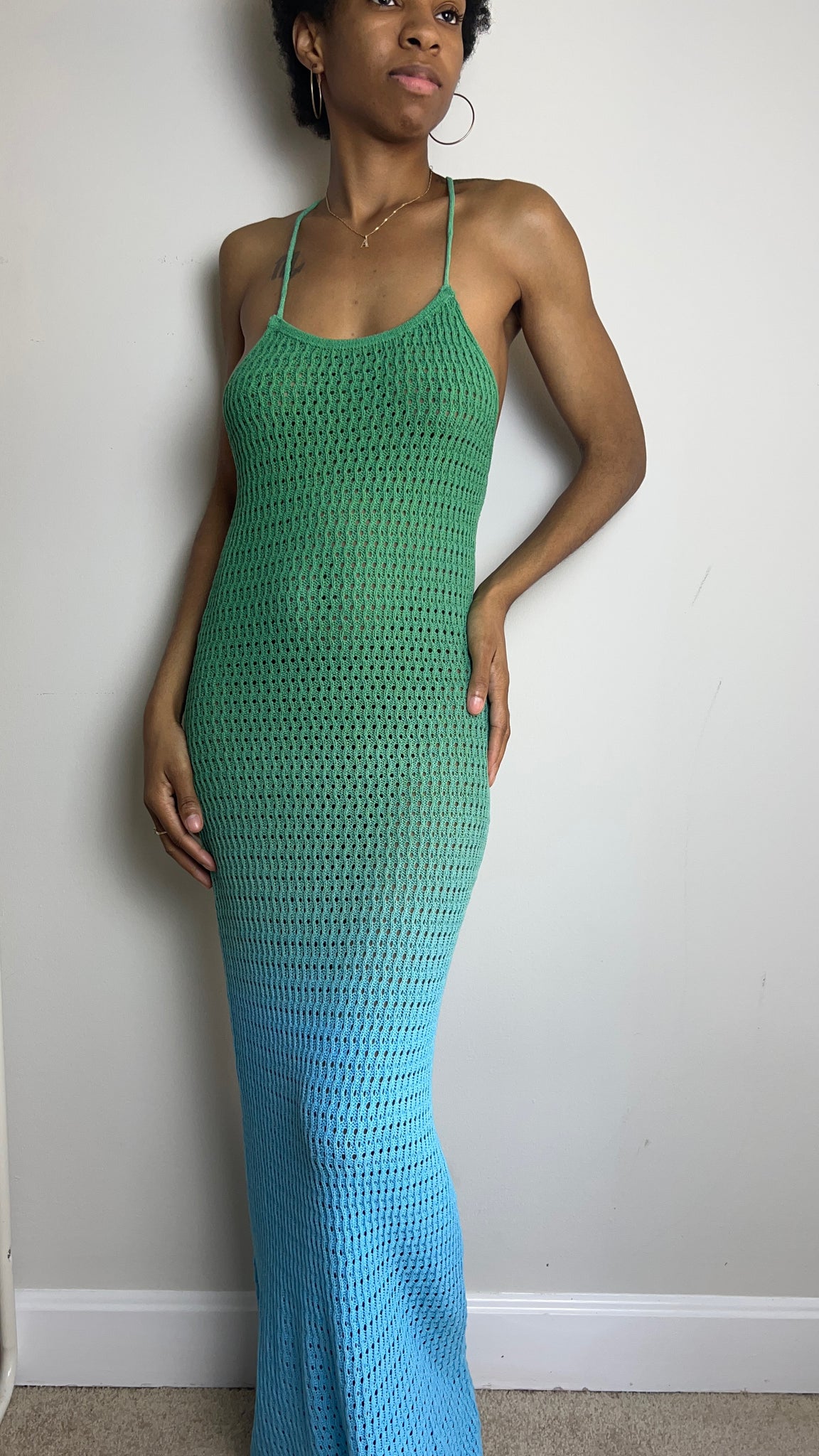Look like an ocean goddess in this stunning ombre crochet mermaid maxi dress! Its sleeveless scoop neckline and cross back will have you feeling like the Ariel of the beach, and its flared hem will have you twirling in the sand. Feel like mermaid royalty in this beautiful blue and green dress!