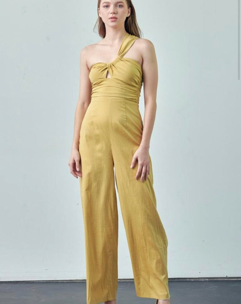 Sleeveless asymmetrical one shoulder jumpsuit.