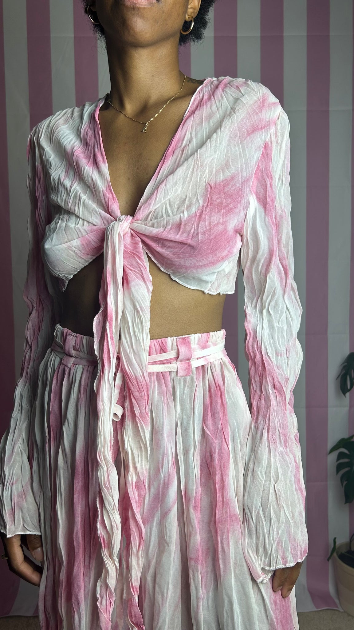 Look like a total dream come true in this ultra-trendy pink crinkled tie dye pant set! Rock the ultimate flares with a long sleeve crop top for the perfect balance of cool and cozy. All the looks, zero effort necessary! 🤩