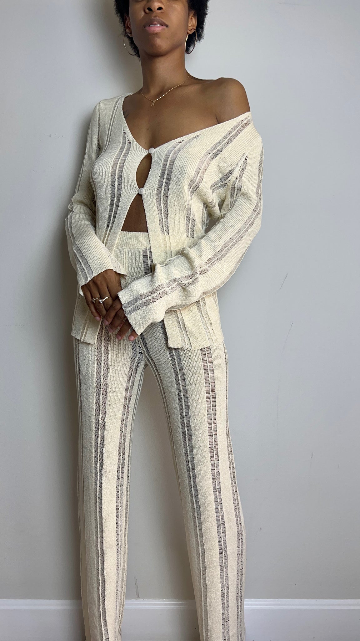 Enter resort-chic style with this Ladder Knit Pant Set! Feel like you’re in the tropics even when you’re not with the long sleeve open cardi and high rise pants – perfect for any sunny or beach-filled day. So soiree in style, fashionista! (You know you want to 😉).