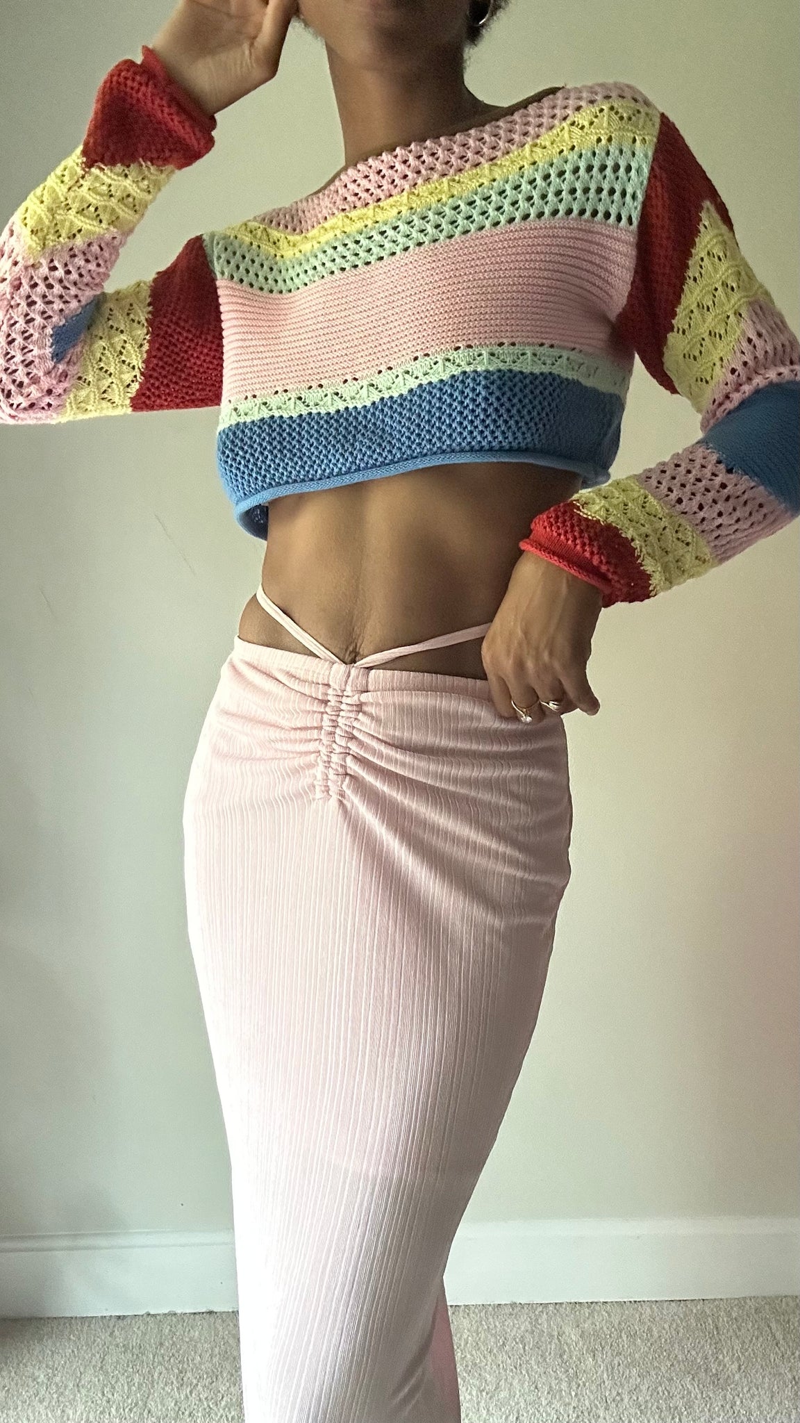 Cozy up in this vibrant, eye-catching long sleeve cropped knit sweater, boasting a bold striped pattern!