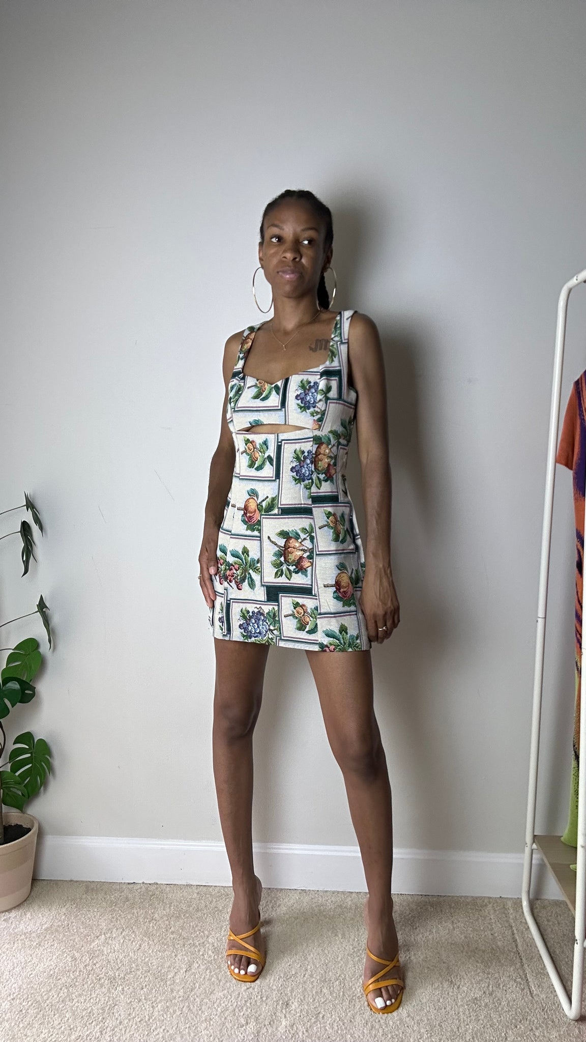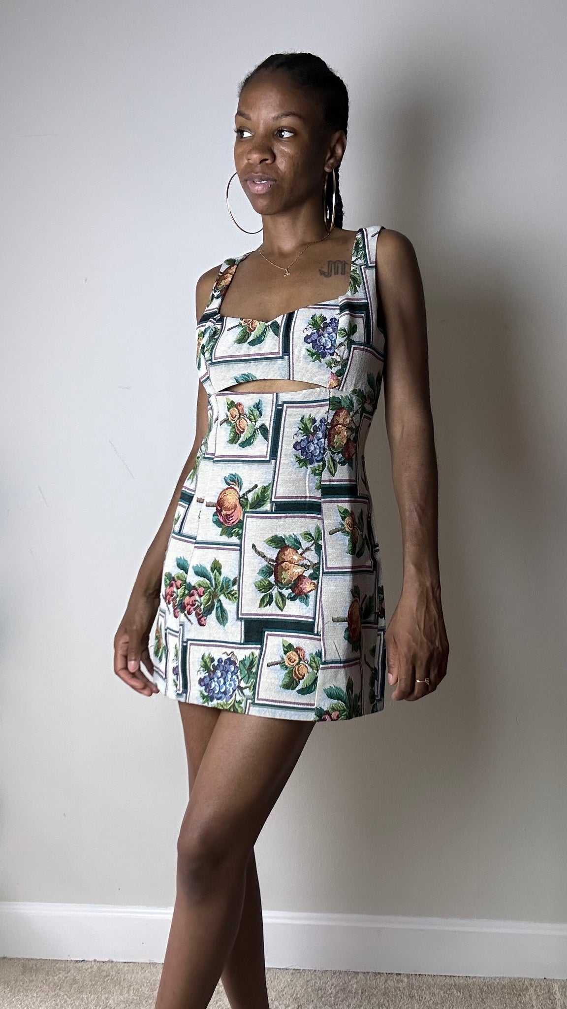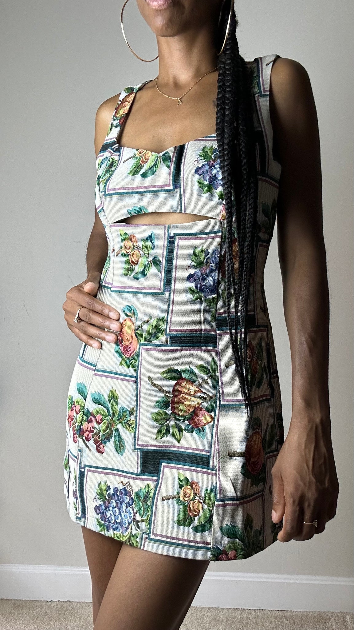 Stay cool and stylish this summer with our jacquard fruit print cutout sleeveless mini dress. The perfect blend of fashion and comfort, this dress will keep you looking and feeling great all day long. The cutout design adds an extra touch of edginess while the jacquard fabric ensures durability.