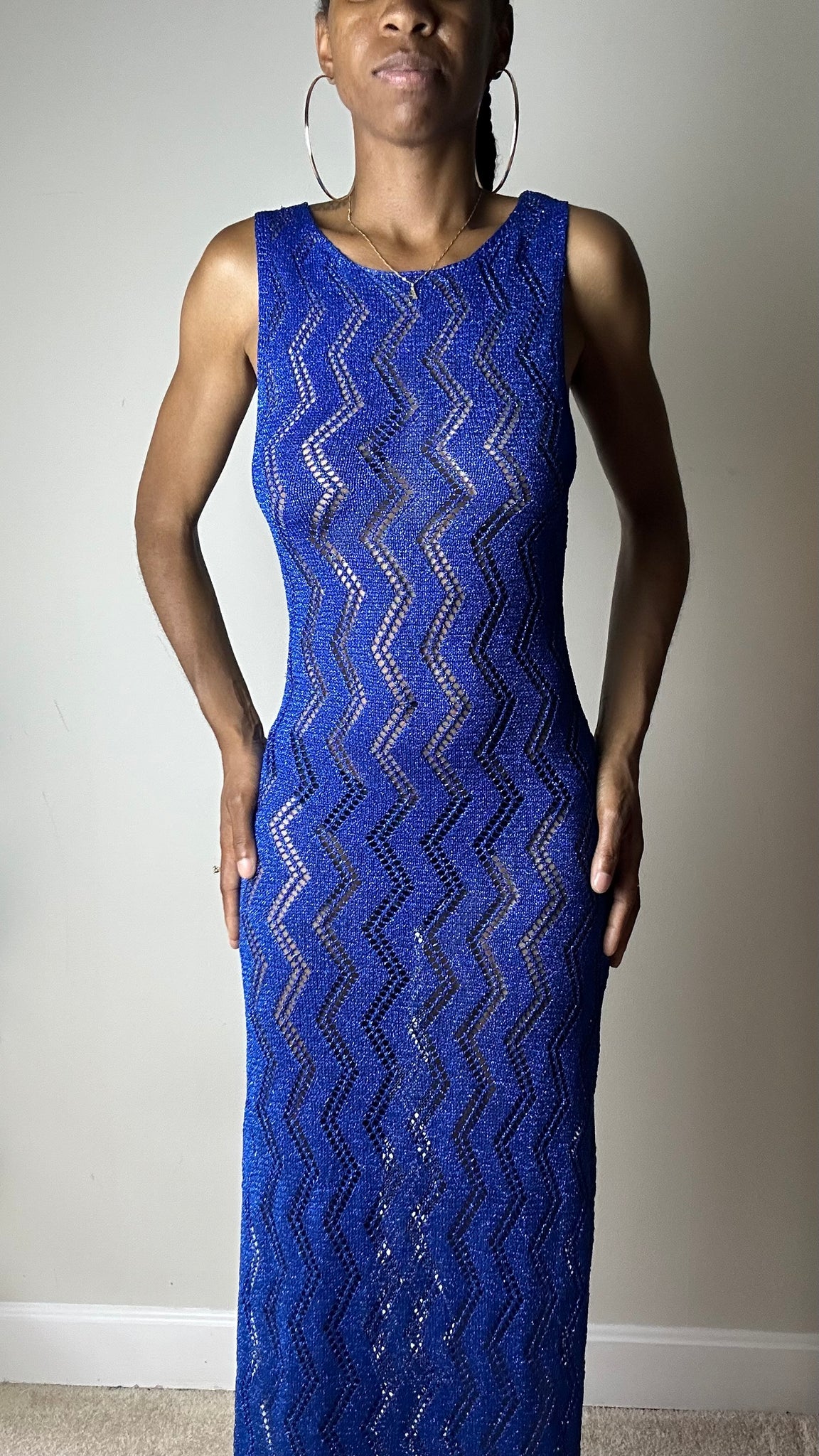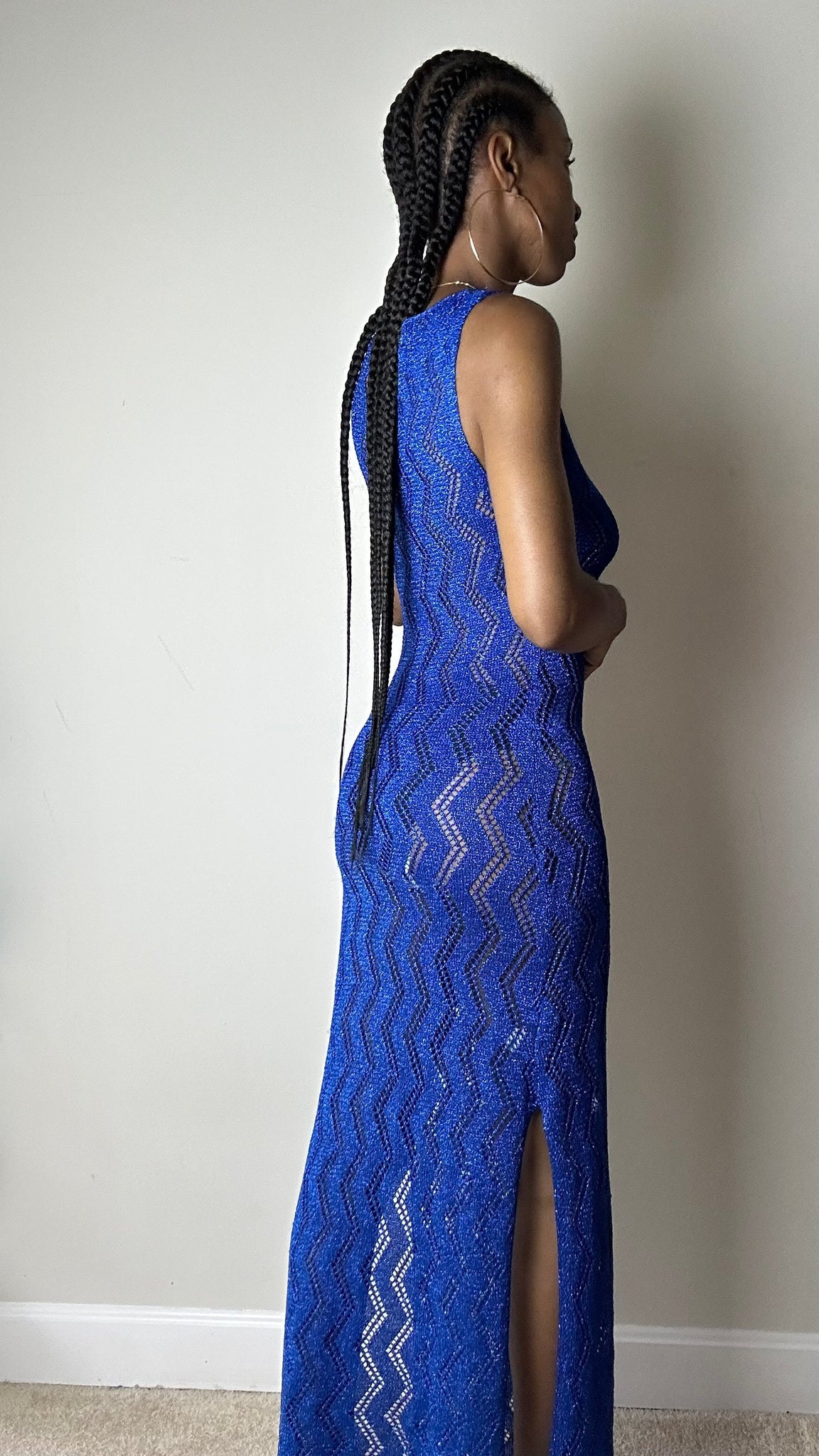 Turn heads and make a statement in our Ocean Blue Knit Crochet Maxi Dress. The delicate zig zag pattern and see through glitter fabric will have you shining like the ocean. Perfect for a beachside dinner or a night out on the town. Dare to be bold and stand out in this stunning dress.