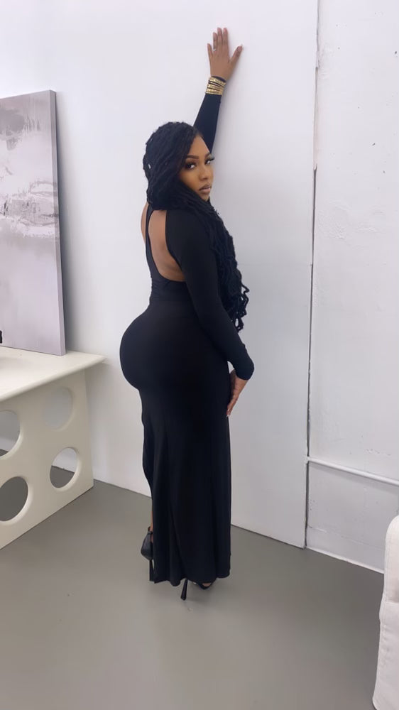 Long sleeve turtleneck dress with front and back cutout detail and thigh high slit