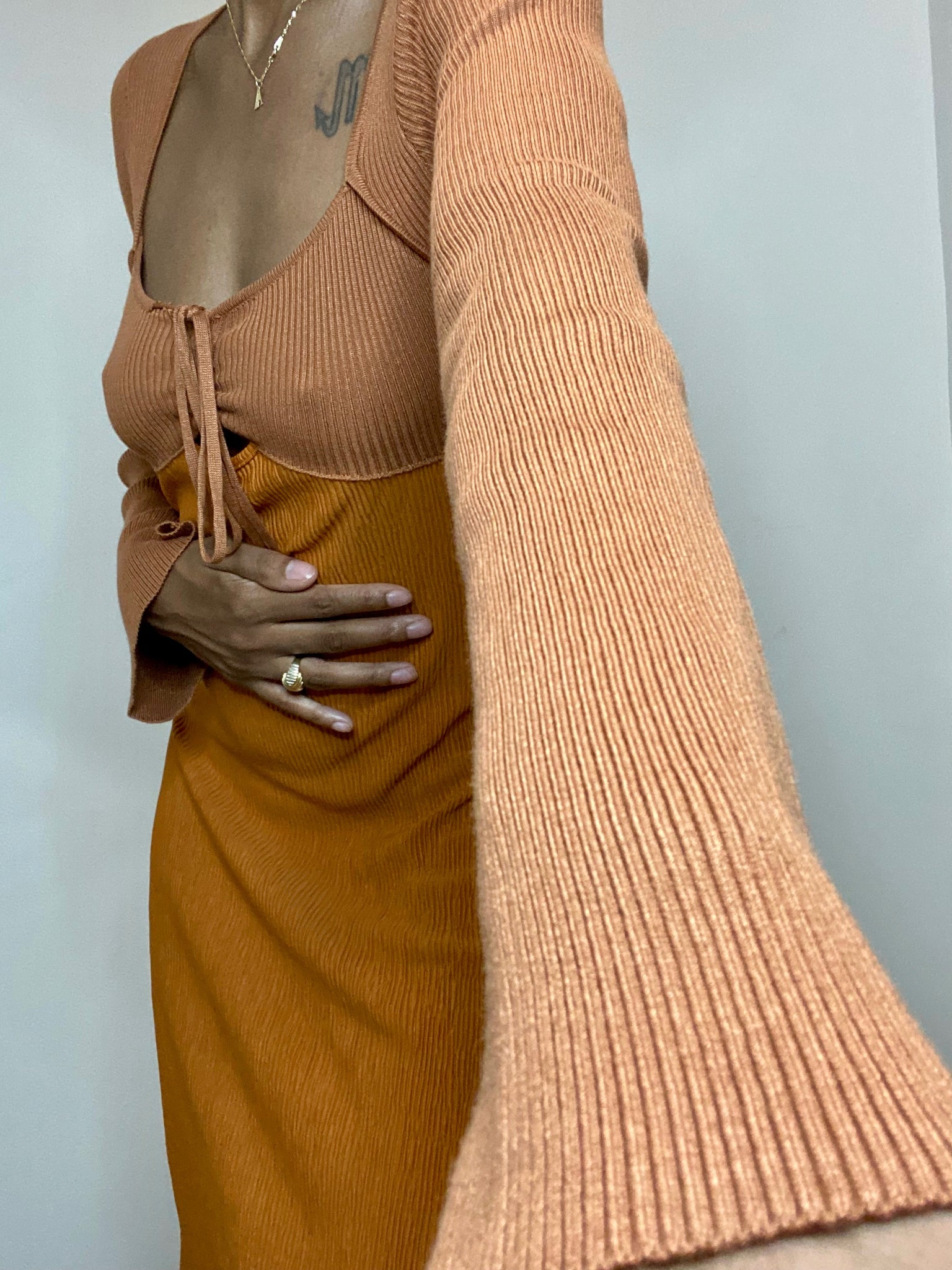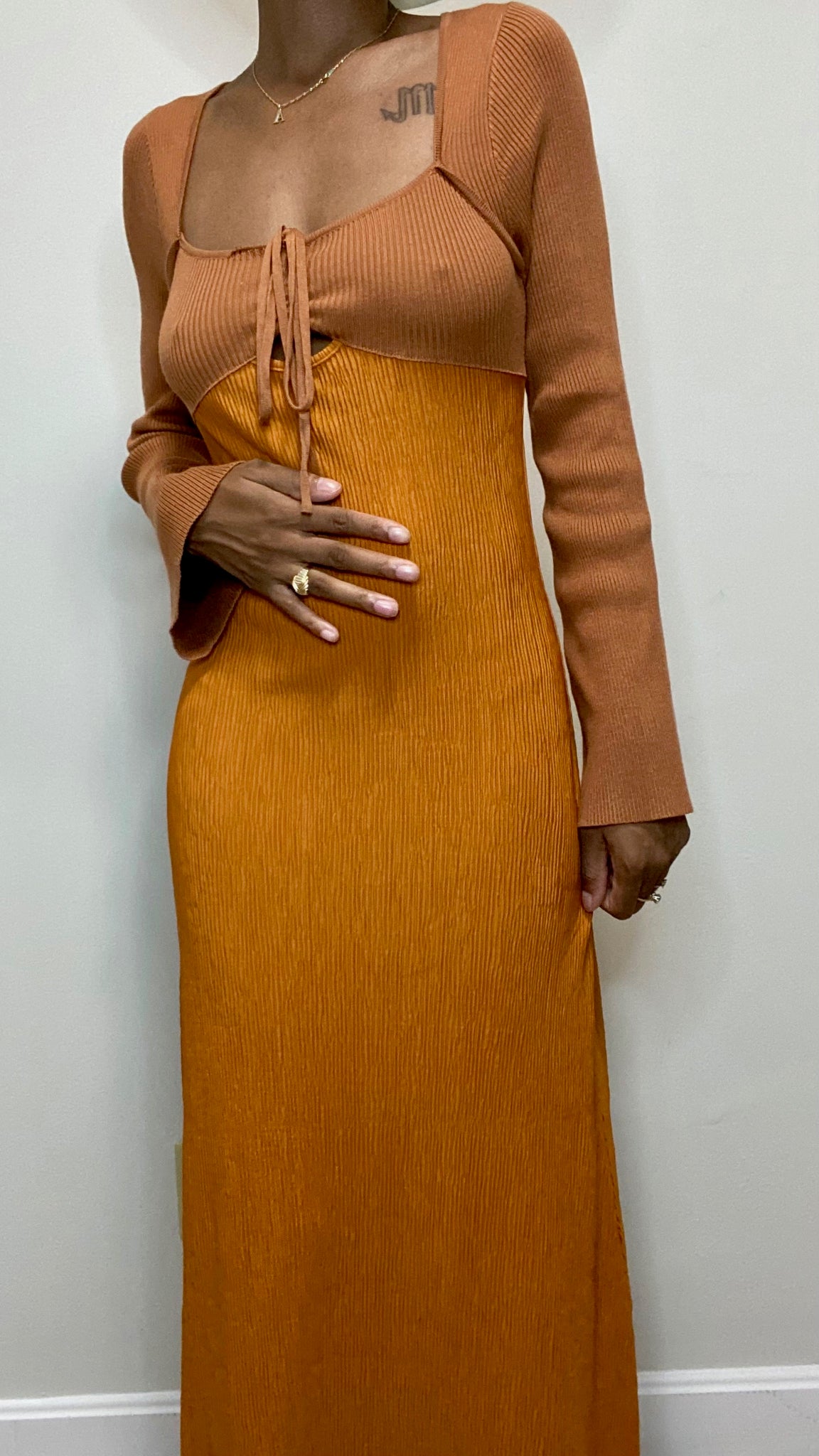 If Fall was a dress it would be this. This ankle length mixed media maxi dress features a ribbed top, pleated bottom, long bell sleeves and a neck tie that can be worn loosely or as a halter.