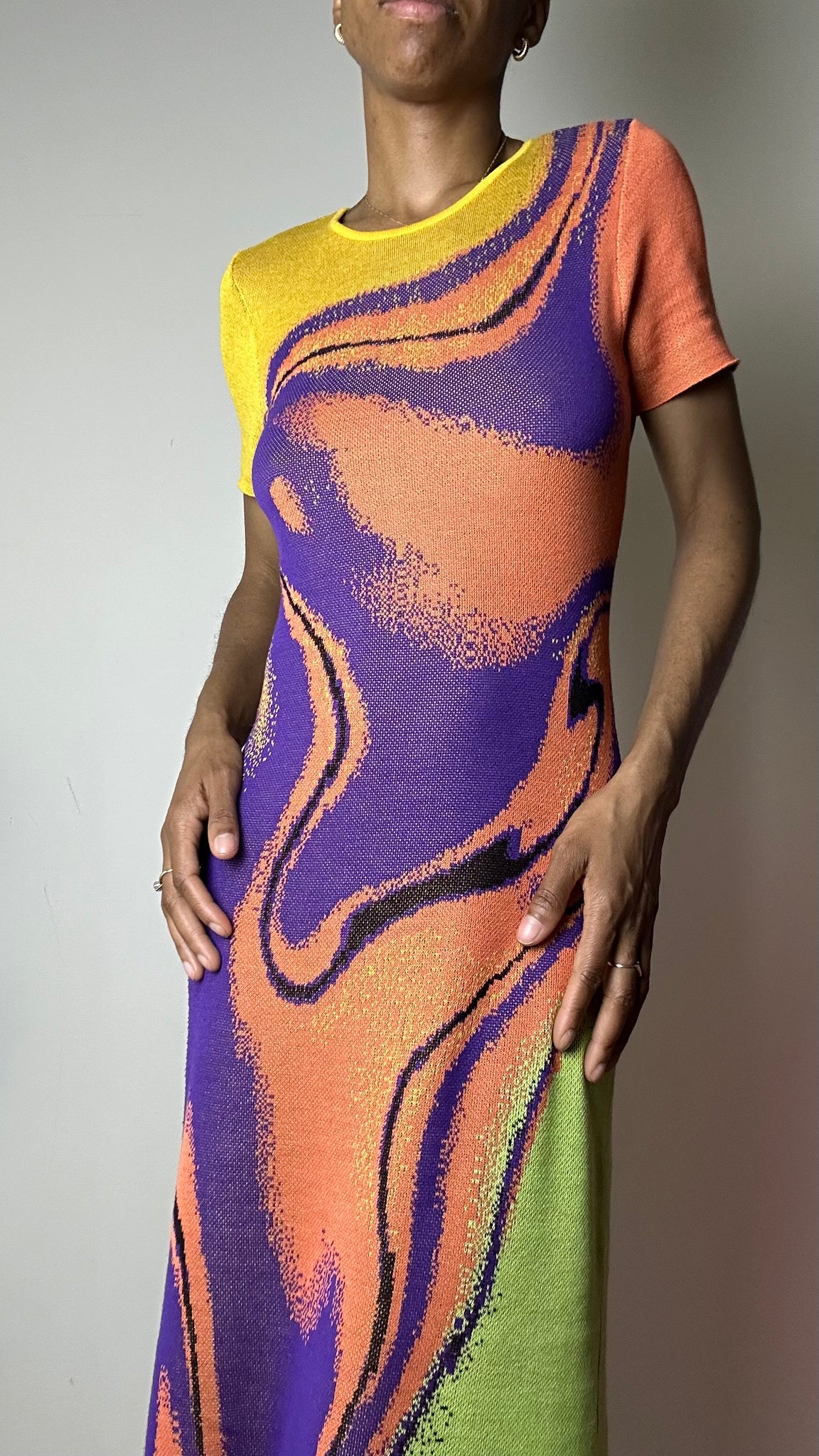 Ride the wave of fashion with our Lava Wave Purple Multicolor Knit Midi Dress. Show off your daring side in this vibrant, short sleeve dress featuring a mesmerizing wave knit pattern. Perfect for making a bold statement and standing out from the crowd.