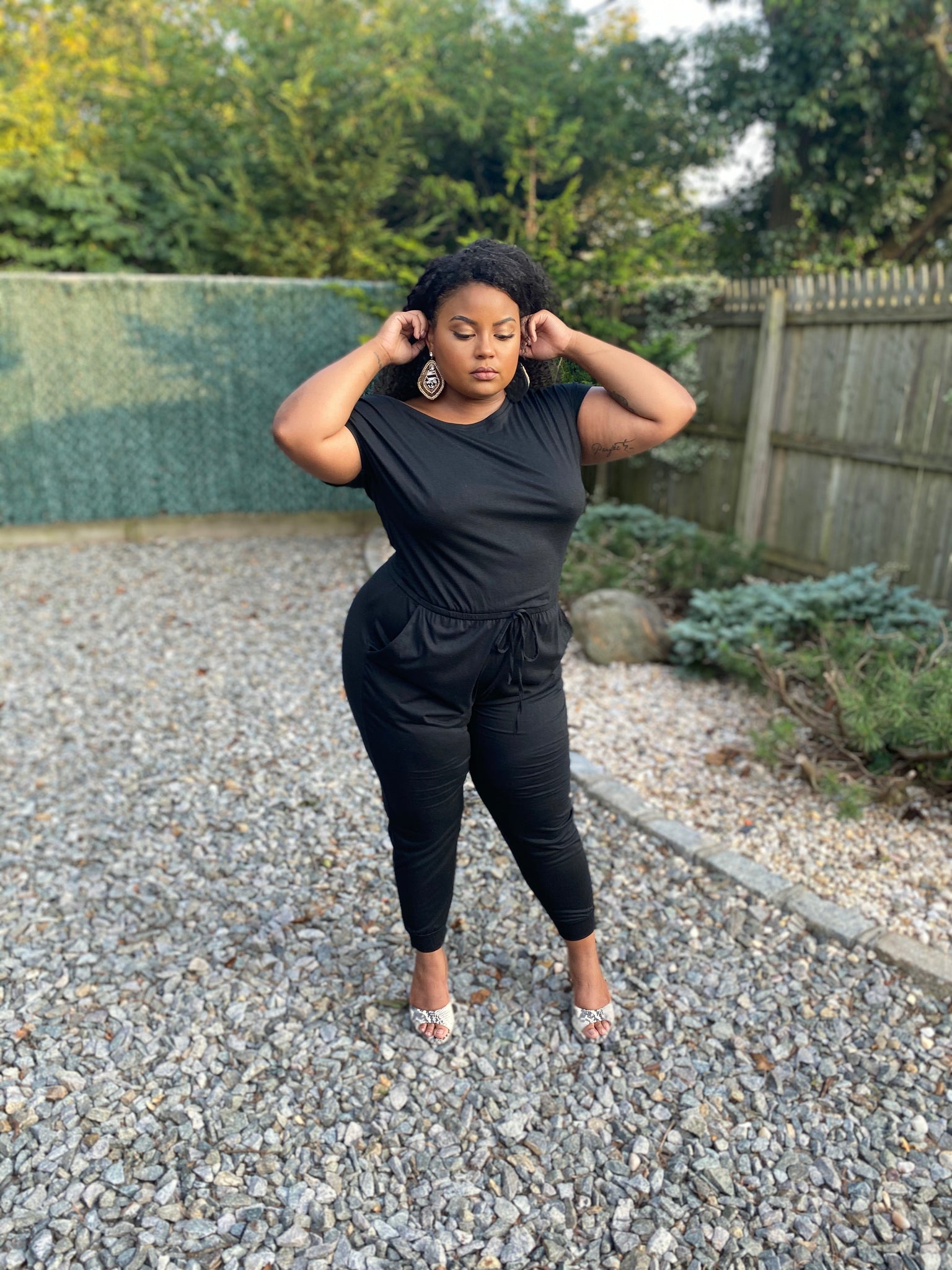 Casual short sleeve, off shoulder jumpsuit with elastic waist, self tie string, tapered legs and deep pockets.