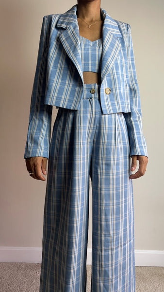 If you ever thought about buying a suit here’s your sign to do it. Strong tailoring is in for the spring and this 3 piece suit screams I’m fashionable but I mean business. Set includes cropped blazer, pants and cropped bralette.
