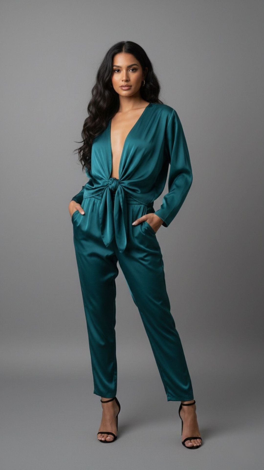 Satin jumpsuit featuring plunging self tie neckline , long sleeves, pleated high waist, front tie closure, elastic waistband and side pockets