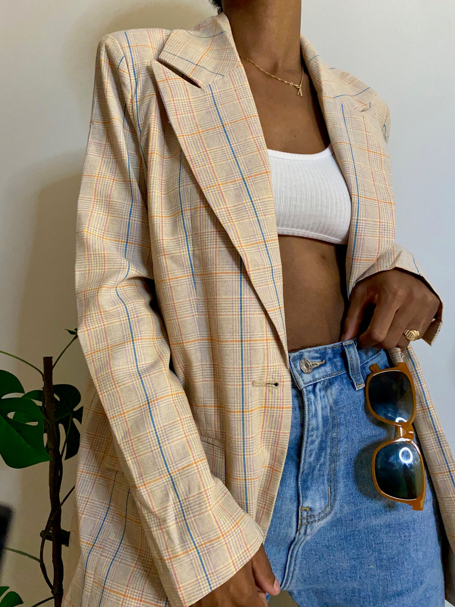 Our love for blazers is endless. They're just an essential part of our wardrobe. Perfect for both business and pleasure. We love this vintage inspired plaid blazer in a boyfriend fit. Its so chic with subtle pops of color. Pair it with trousers for work or jeans and a crop tank for casual outing.